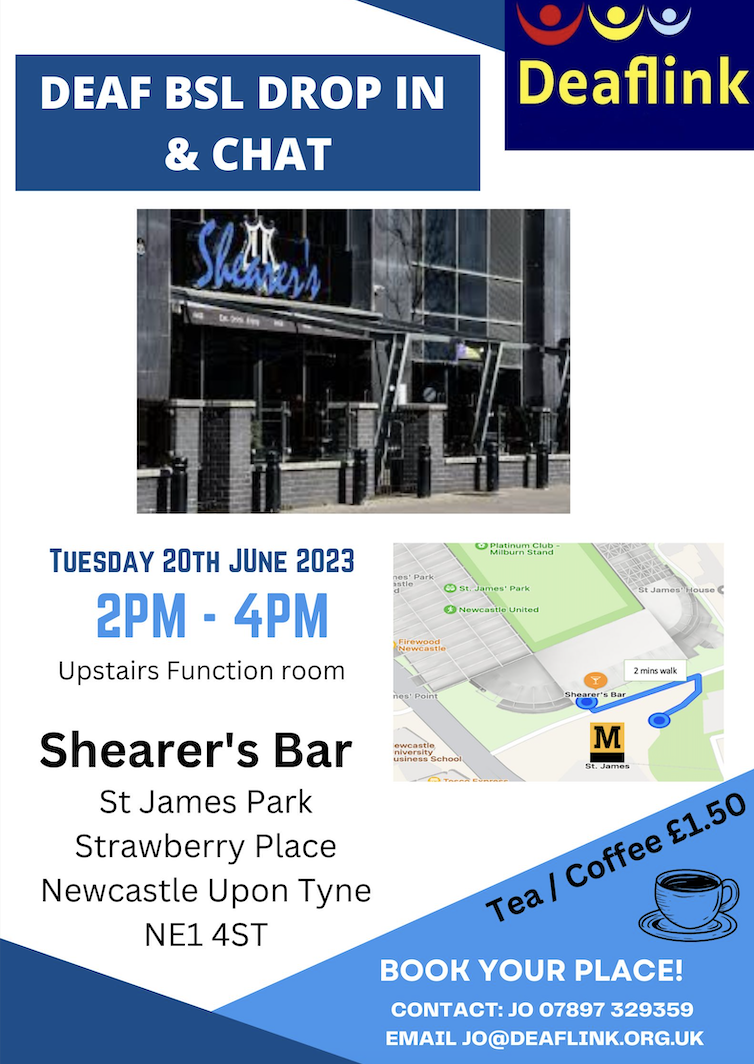 20 Jun Deaf BSL Drop in & Chat group 20 Jun 2023 at 1:00pm This event has passed. Shearer's Bar St James Park Strawberry Place Newcastle Upon Tyne NE1 $ST More information for Deaf BSL Drop in & Chat group